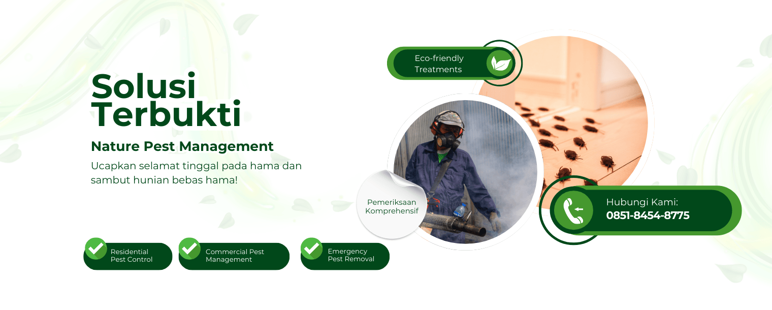 Kami adalah Nature Pest Management, merek dari PT NASYA NUSANTARA PESTINDO, penyedia layanan pengendalian hama profesional di Jakarta dan sekitarnya. Kami fokus mengatasi akar masalah hama, bukan hanya gejalanya. Dengan inspeksi menyeluruh, kami menyusun strategi efektif dan menggunakan solusi terdepan di industri ini untuk rumah atau bisnis Anda.